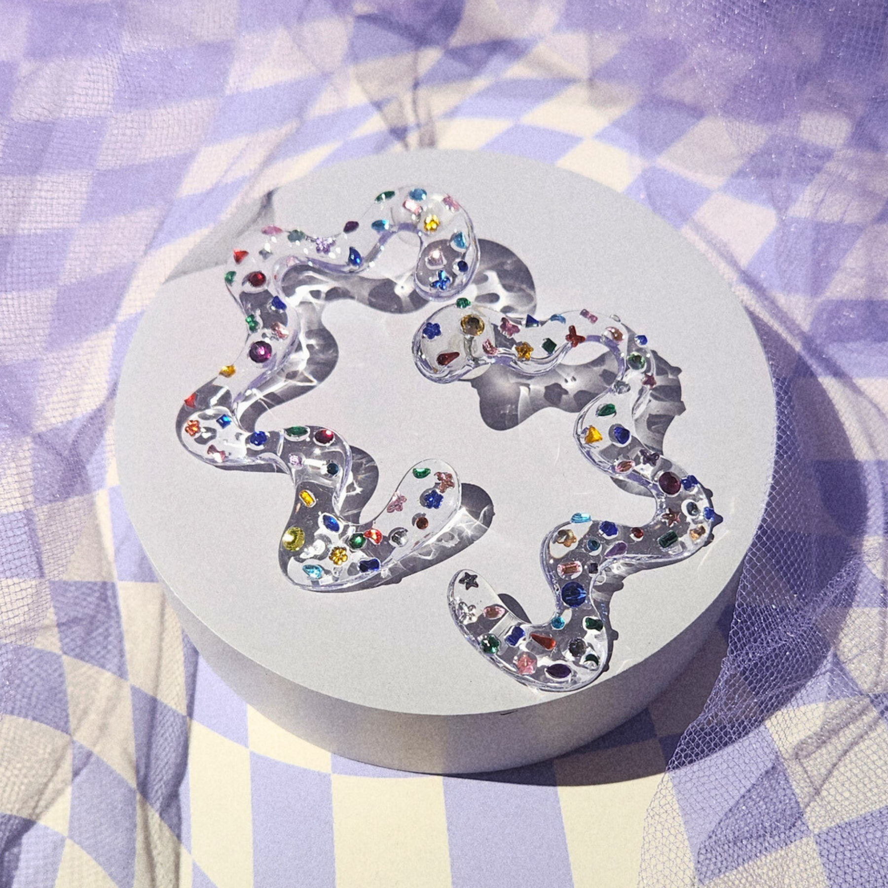 Of course, our squiggle earrings are still drawn by hand and cured. Each multi-shaped rhinestone is individually placed, making no 2 earrings alike.
